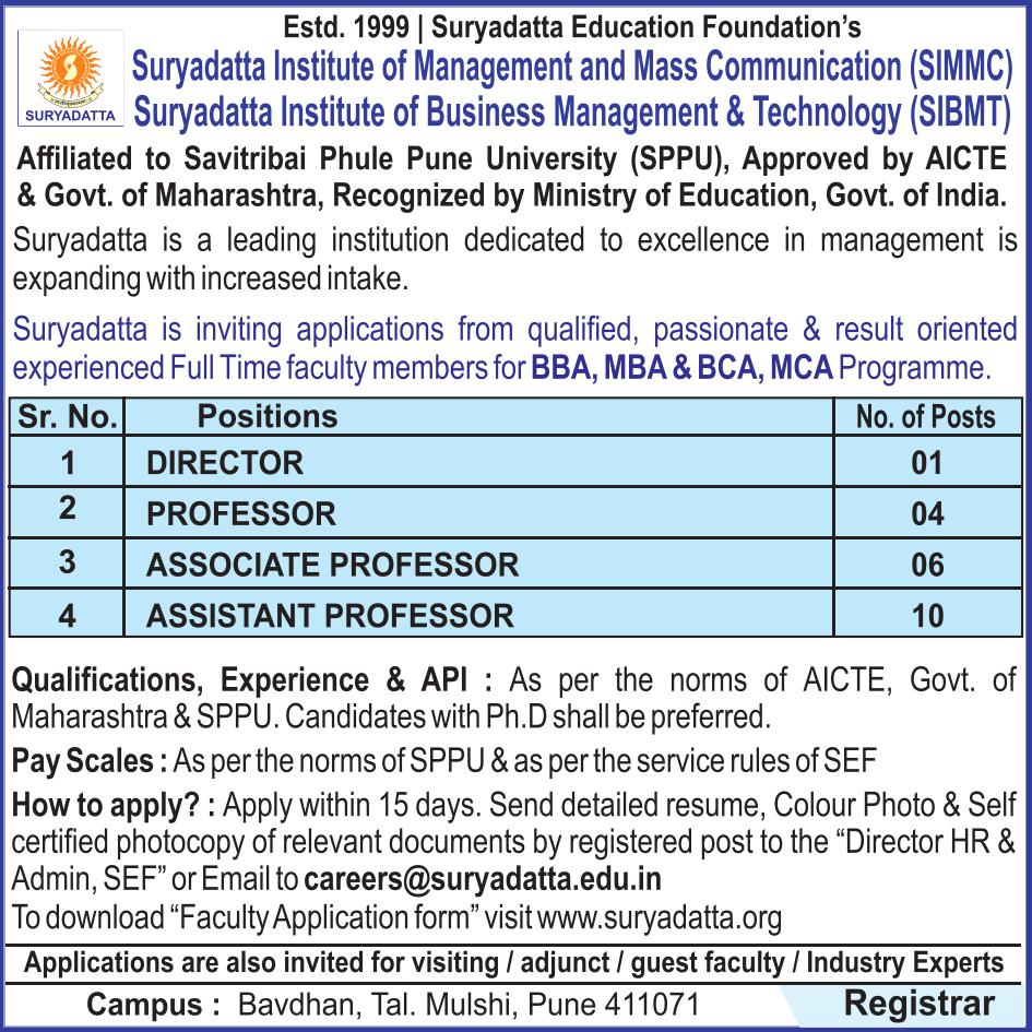 The Suryadatta Group of Institutes was incepted in the year 1999, under the aegis of the Suryadatta Foundation in Pune. The Suryadatta family has blossomed into a bouquet of academic institutions in various disciplines such as Information Technology, Management, Media & Mass Communication, Bio-Informatics, Bio Technology, Retail, FMCG, Telecommunication, Interior Designing, Fashion & Jewellery Designing, Creative Arts, Vocational & Advanced Studies etc. With such a wide range of courses Suryadatta always needs aspiring applicants for various posts in its various Institutes. The Institute follows a open work culture and supports individual growth along with the growth of the organization. To apply in Suryadatta please fill in the following form along with all details. Our HR Executive will get in touch with you for the next procedures.