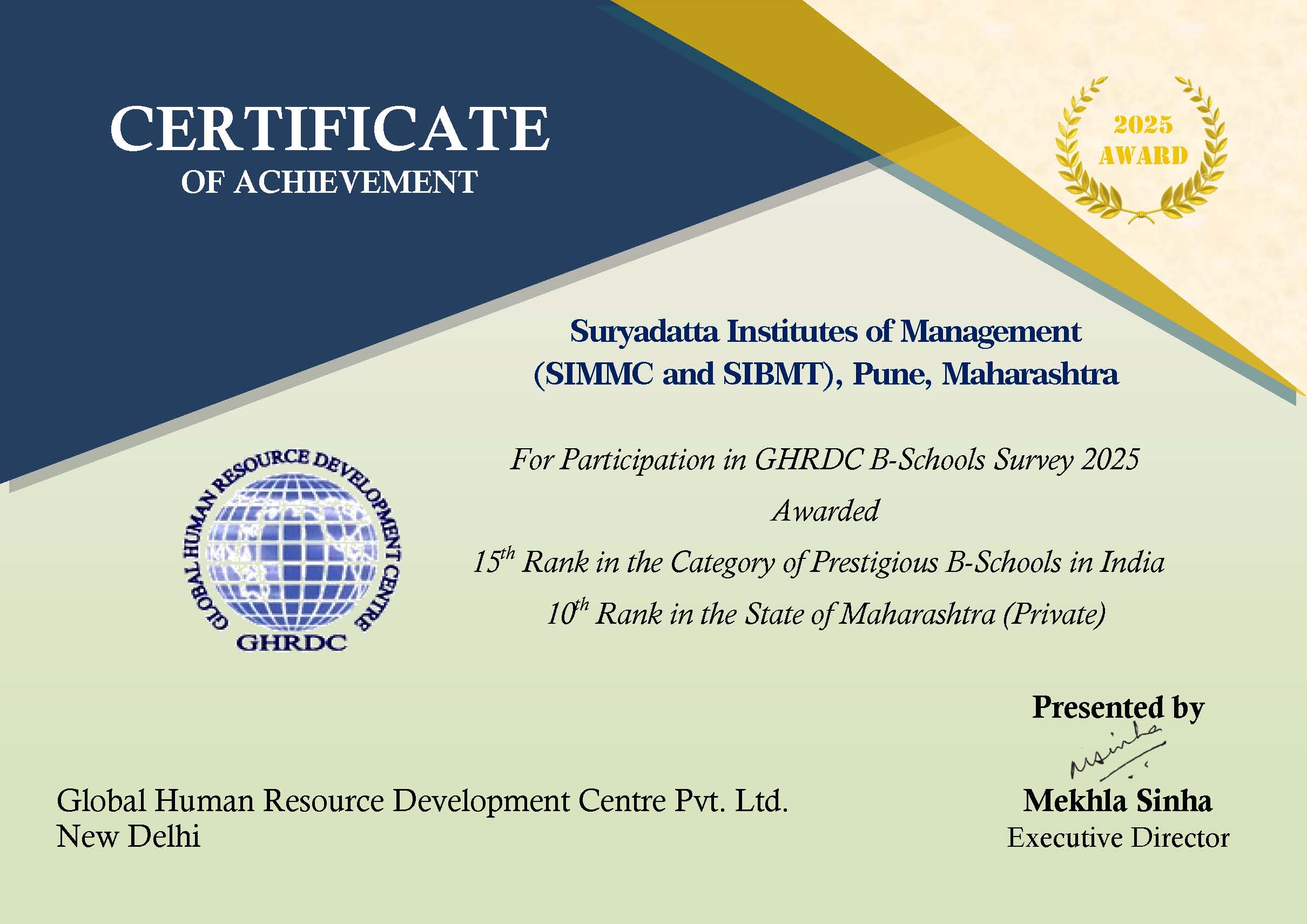 Suryadatta Institute of Business Management & Technology (SIBMT) is Affiliated to Savitribai Phule Pune University and approved by AICTE & Govt. of Maharashtra, recognized by Ministry of HRD, Govt. of India. (Approval letter no. 07/08/MS/MBA/010 | Govt. of Maharashtra GR No. TEM-2012/Pra. Kra. 98 (Part 1)/Tanshi 4)