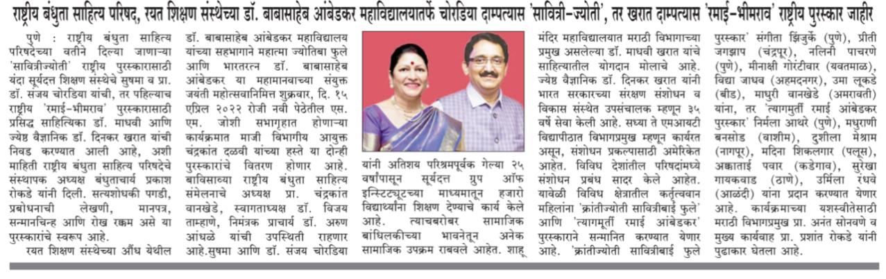 Professor Dr. Sanjay B. Chordiya, Founder President and Chairman and Mrs. Sushama S. Chordiya, Vice President of Suryadatta Education Foundation have been conferred with 'Savitri-Jyoti' Award by Rashtriya Bandhuta Sahitya Parishad, Rayat Shikshan Sanstha's Dr. Babasaheb Ambedkar College.